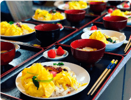 朝食の時間。食堂に集まり、みんなで「いただきます」。ご飯、味噌汁、焼き魚、煮物など家庭的な和食が中心です。食事中の会話も自然と弾みます。