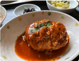 昼食は、栄養士が考えたバランスの良いメニュー。肉じゃが、煮込みハンバーグ、季節の野菜を使った副菜など、見た目も味も工夫されています。